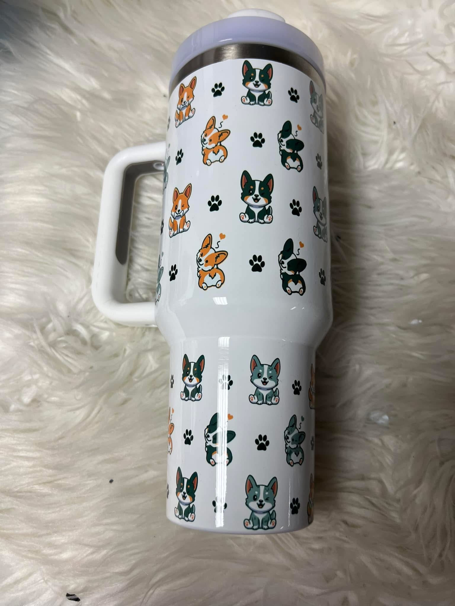 This 40 ounce stainless steel Tumblr with handle is perfect for any corgi lover. Not only is it adorned with an adorable corgi design, but it also includes a plastic straw for easy sipping. Show off your love for your furry friends while staying hydrated in style.