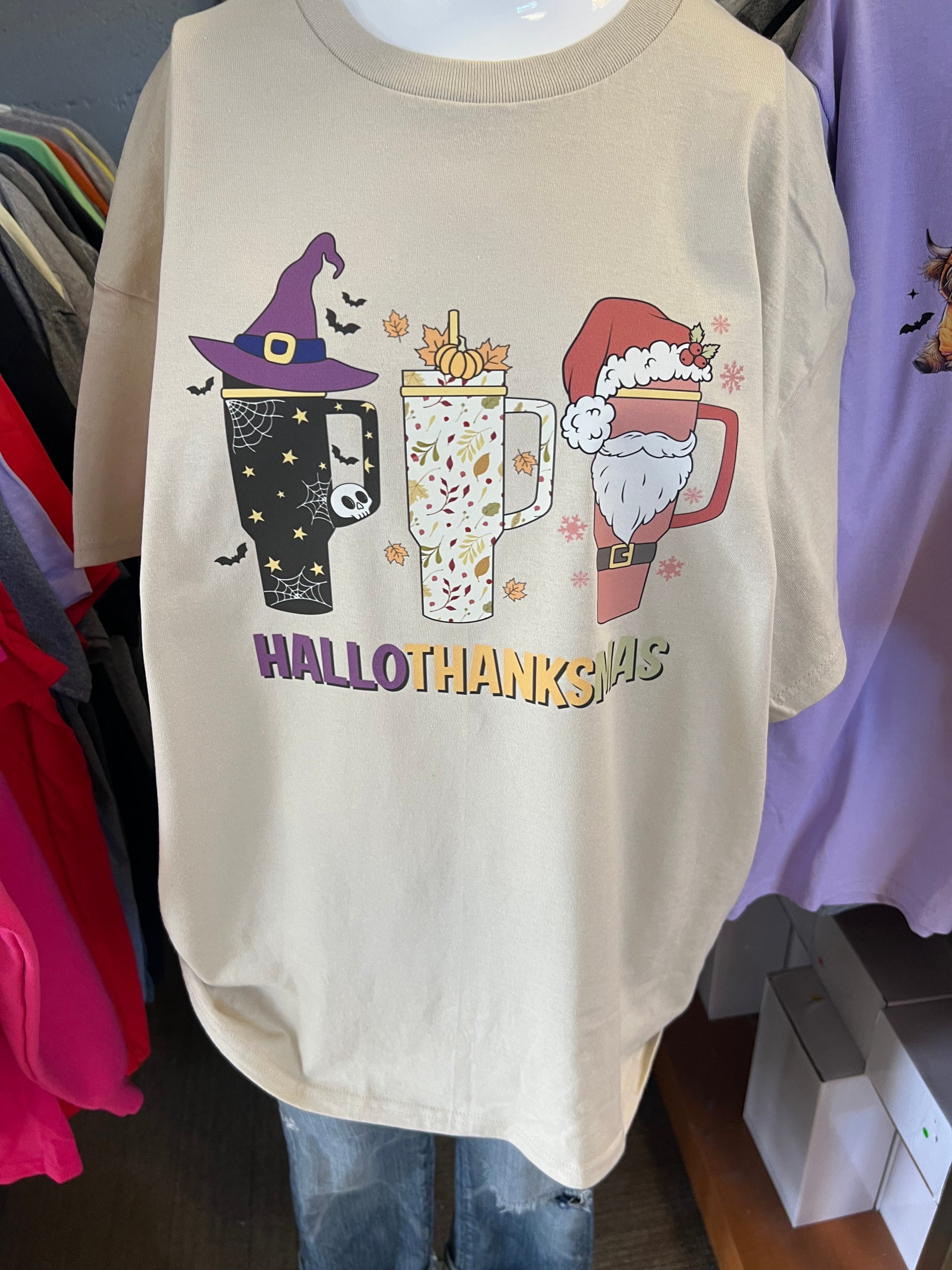 New unisex T-shirt Halloween Thanksgiving, Christmas, all in one design 40 ounce Tumblr handles